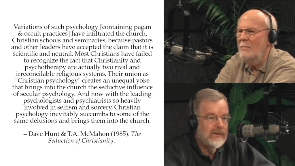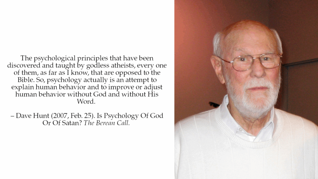 My greatest wake up call about psychology was when I came across the teachings of Dave Hunt. He made some fantastic exposes on the field of psychology. Driving to and from work, I was listening to radio recordings of his site, The Berean Call, and learned shocking new things about the history of psychology and its atheistic origins.