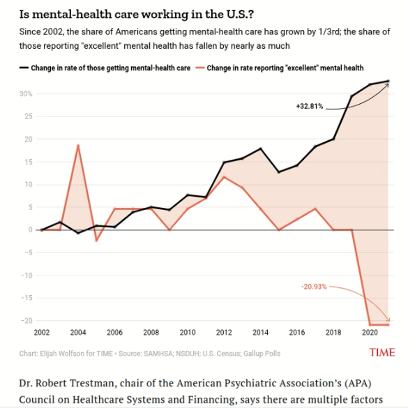 It’s pretty clearly showing that greater use of mental health services coincides with worsening mental health. This brings to mind a couple of researchers from the 60’s, Truax and Carkhuff, who concluded that on the average, psychotherapy may be harmful as often as it is helpful, with an average effect comparable to receiving no help.