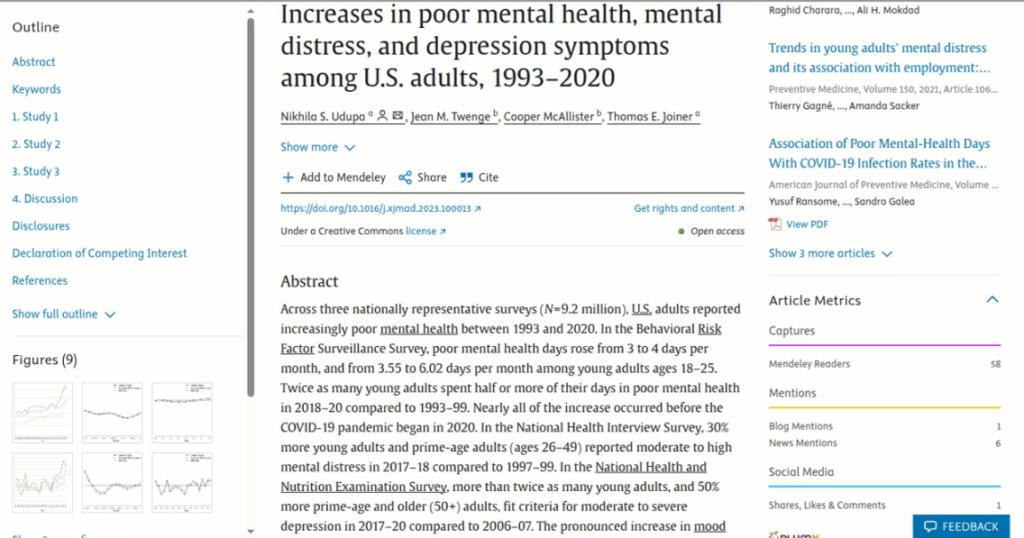 From the article: “Twice as many young adults spent half or more of their days in poor mental health in 2018–20 compared to 1993–99. Nearly all of the increase occurred before the COVID-19 pandemic began in 2020.”
