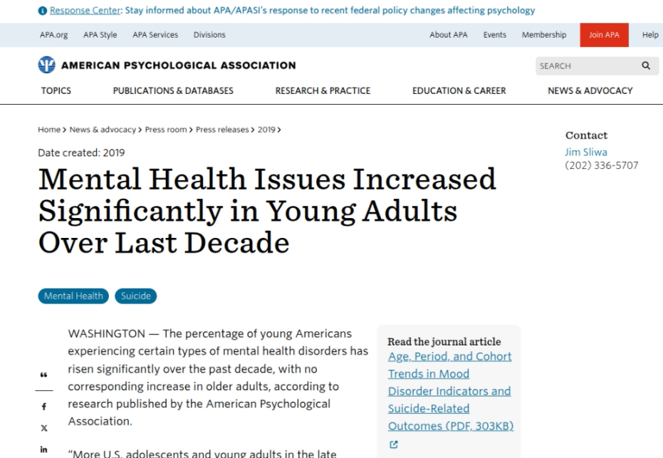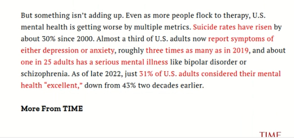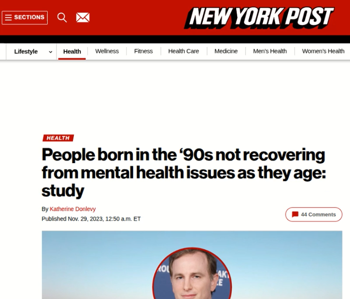 Also from the article: “Our data not only shows a continuing decline in the mental health of the current crop of young people but continues to affect older generations today heading into their 40s and 50s. We are not seeing the rebound out of young adulthood that previous generations saw as they aged.”