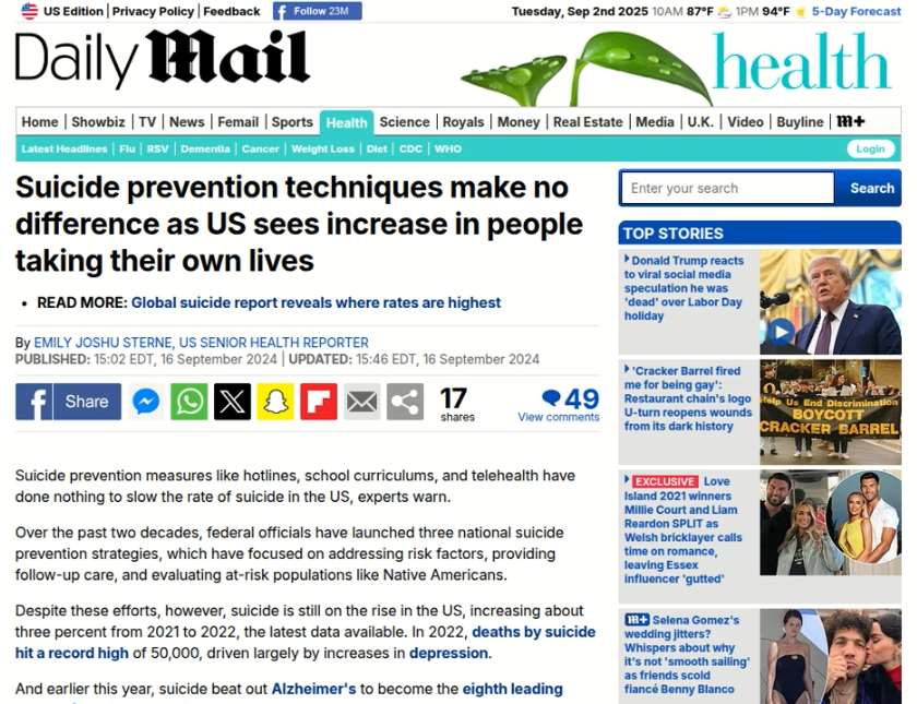 And now some may counter: well, something’s wrong with the research. You’re cherry-picking the research. And to that I will answer: the ultimate test of any research is to match it up against what’s happening in the world, what you can observe in the world. Despite what some may argue, there is more access to mental health services than there has ever been before, the stigma of having a mental health diagnosis has decreased (not increased), and the use of mental health services has gone up over time, not down. Therefore, you would expect that societal mental health would have improved, if these so-called experts knew what they were doing. So, let’s see what’s actually happening with mental health in the news, shall we?