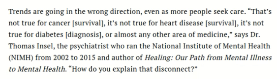 However, looking at this chart, we see a much bleaker picture than those two researchers concluded. The nation-wide data shows an average effect suggesting that active harm is being done. Or maybe a large portion of the people getting mental health care are simply stuck on a wait list going crazy – I don’t know. We do know that natural recovery is a reality. The chart does say “getting,” not “seeking,” so I will assume these people are receiving the mental health care. You know, if the data for cholesterol medication showed that the more people took it, the higher their cholesterol got, wouldn’t you think there’s a serious problem with the medicine? Look at this: