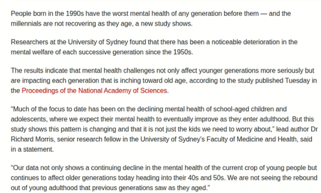 From the article: “Researchers at the University of Sydney found that there has been a noticeable deterioration in the mental welfare of each successive generation since the 1950s.”