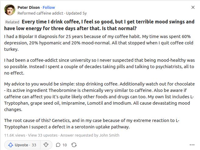 Here we have an anecdote from Quora, of a man who was under the impression he had bipolar for 25 years, when actually coffee was to blame. He notes that his time spent under the care of psychiatry did nothing but that quitting coffee fixed his depression and hypomania issues.